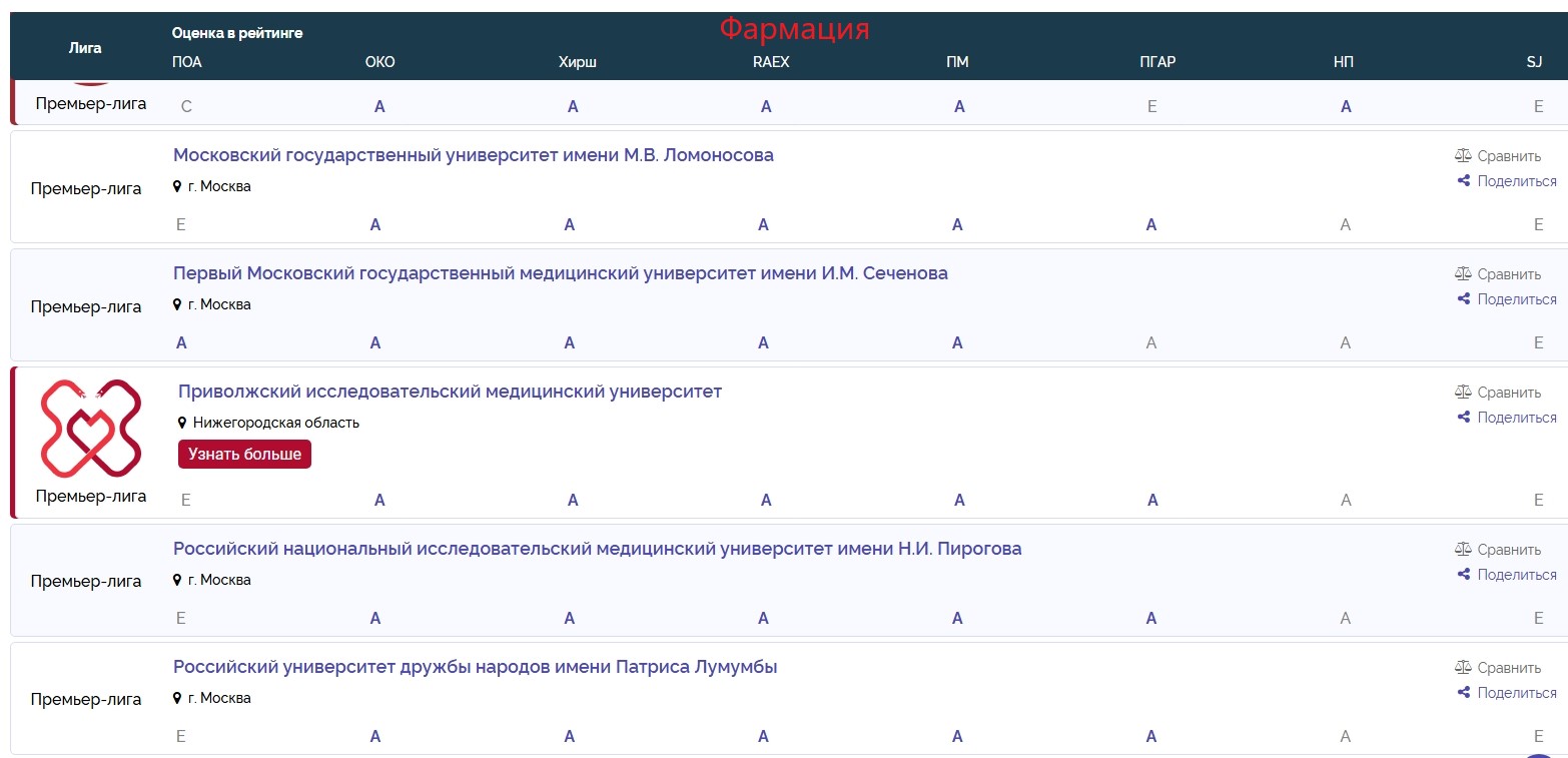 Восьмое место (из 100 вузов) — между ПСПБГМУ им. академика И.П. Павлова и РНИМУ им. Н.И. ПироговаФармация: премьер-лига