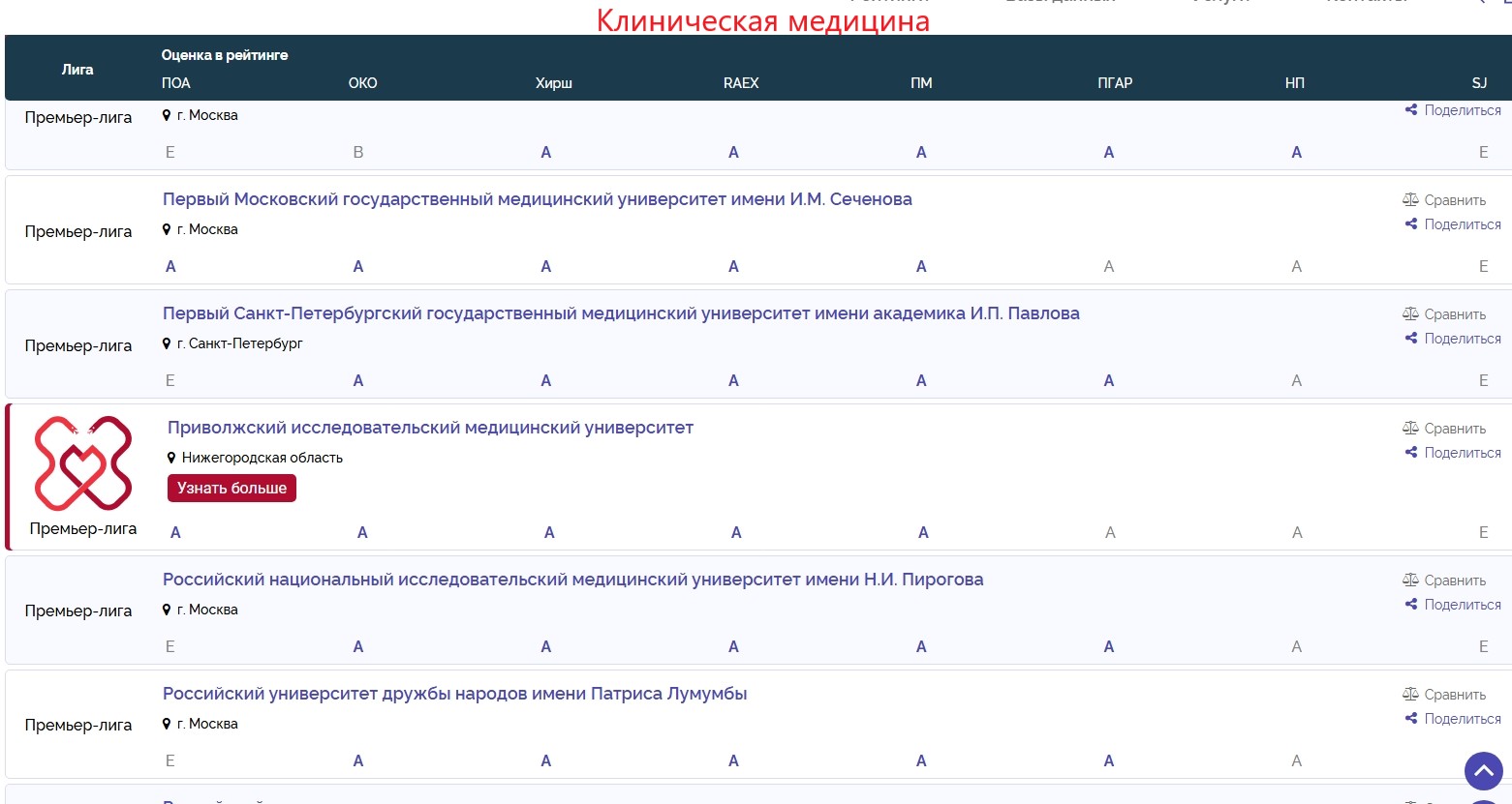 Пятое место (из 42 вузов) — между Казанским ГМУ и Санкт-Петербургским государственным педиатрическим медицинским университетом- Предметный рейтинг по результатам профессионально-общественной аккредитации