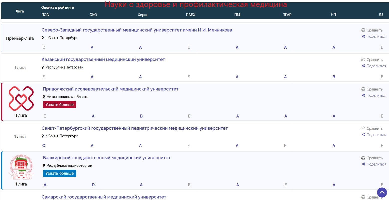 Восьмое место (из 76 вузов) — между ПМГМУ им. И.М. Сеченова и РНИМУ им. Н.И. Пирогова.Науки о здоровье и профилактическая медицина: 1 лига