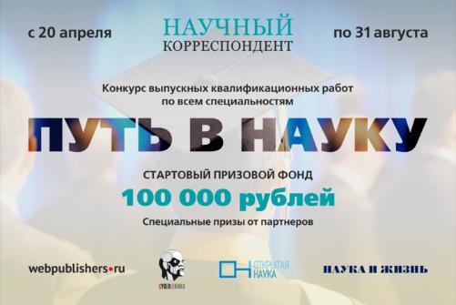 20 апреля 2020 г. стартовал Конкурс научных публикаций для выпускников российских вузов «Путь в науку» Принять участие в конкурсе смогут все выпускники вузов России за последние три года, которые в рамках конкурса опубликуют полный текст своей работы на портале «Научный корреспондент».