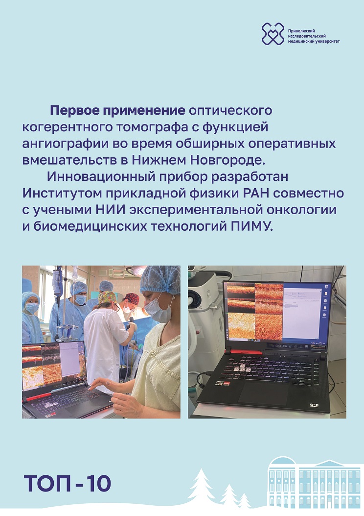 Первое применение оптического когерентного томографа с функцией ангиографии во время обширных оперативных вмешательств в Нижнем Новгороде. Инновационный прибор разработан Институтом прикладной физики РАН совместно с учеными НИИ экспериментальной онкологии и биомедицинских технологий ПИМУ. - Участие в программе «Приоритет-2030».
