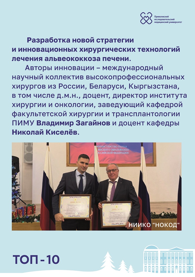 Разработка новой стратегии и инновационных хирургических технологий лечения альвеококкоза печени. Авторы инновации – международный научный коллектив высокопрофессиональных хирургов из России, Беларуси, Кыргызстана, в том числе д.м.н., доцент, директор института хирургии и онкологии, завкафедрой факультетской хирургии и трансплантологии ПИМУ Владимир Загайнов и доцент кафедры Николай Киселёв. Авторский коллектив ученых был награжден премией Правительства РФ 2025 года в области науки и техники и медицинской науки. - Лидерство в научной аккредитации.