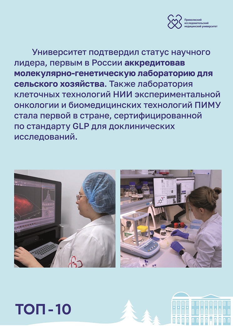 Университет подтвердил статус научного лидера, первым в России аккредитовав молекулярно-генетическую лабораторию для сельского хозяйства. Также лаборатория клеточных технологий НИИ экспериментальной онкологии и биомедицинских технологий ПИМУ стала первой в стране, сертифицированной по стандарту GLP для доклинических исследований. - Цифра и социальная ответственность.