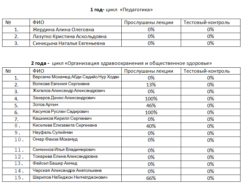 Ниже список врачей-ординаторов не прошедших цикл в январе. Тем, кто приступил к выполнению заданий в январе, необходимо повторно скачать программу и продолжить обучение.