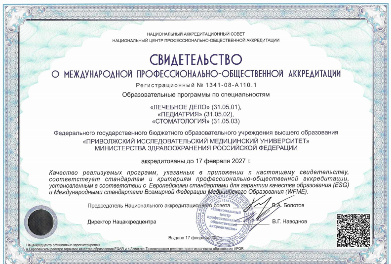 17 февраля 2021 года состоялось заседание Национального аккредитационного совета под председательством академика Российской академии образования В.А. Болотова. На заседании совета принято решение о международной профессионально-общественной аккредитации Национальным центром профессионально-общественной аккредитации медицинских образовательных программ, реализуемых в Приволжском исследовательском медицинском университете (трех программ специалитета — 31.05.01 Лечебное дело, 31.05.02 Педиатрия, 31.05.03 Стоматология и четырех программ ординатуры — 31.08.49 Терапия, 31.08.67 Хирургия, 31.08.01 Акушерство и гинекология, 31.08.36 Кардиология), по стандартам и критериям, установленным в соответствии с Европейскими стандартами для гарантии качества образования (ESG) и Международными стандартами Всемирной Федерации Медицинского Образования (WFME).
