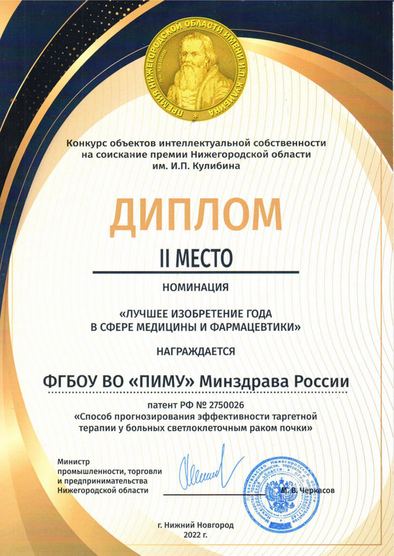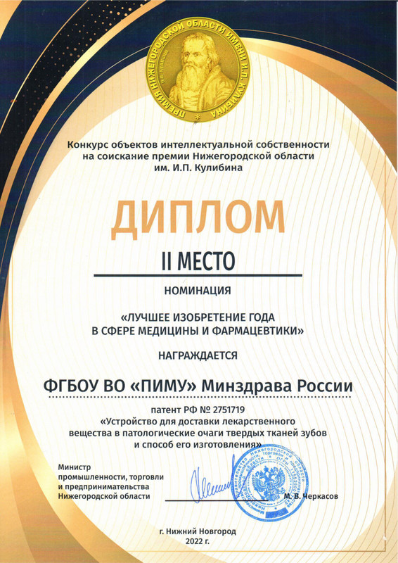 Вручение дипломов Дипломов победителям и призерам конкурса объектов интеллектуальной собственности на соискание Премии Нижегородской области им. И.П. Кулибина состоялось 19 июля. ПИМУ занял второе место в номинации «Лучшее изобретение года в сфере медицины и фармацевтики». Победителями стали: